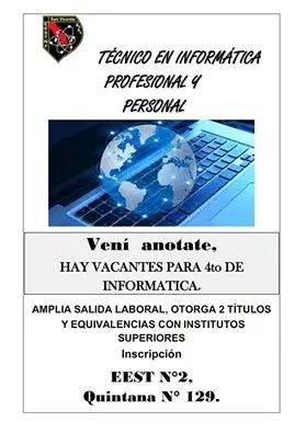 La escuela Técnica Nº 2 de San Vicente informó que todavía se encuentra abierta la inscripción para 4to año del secundario en la orientación Informática.