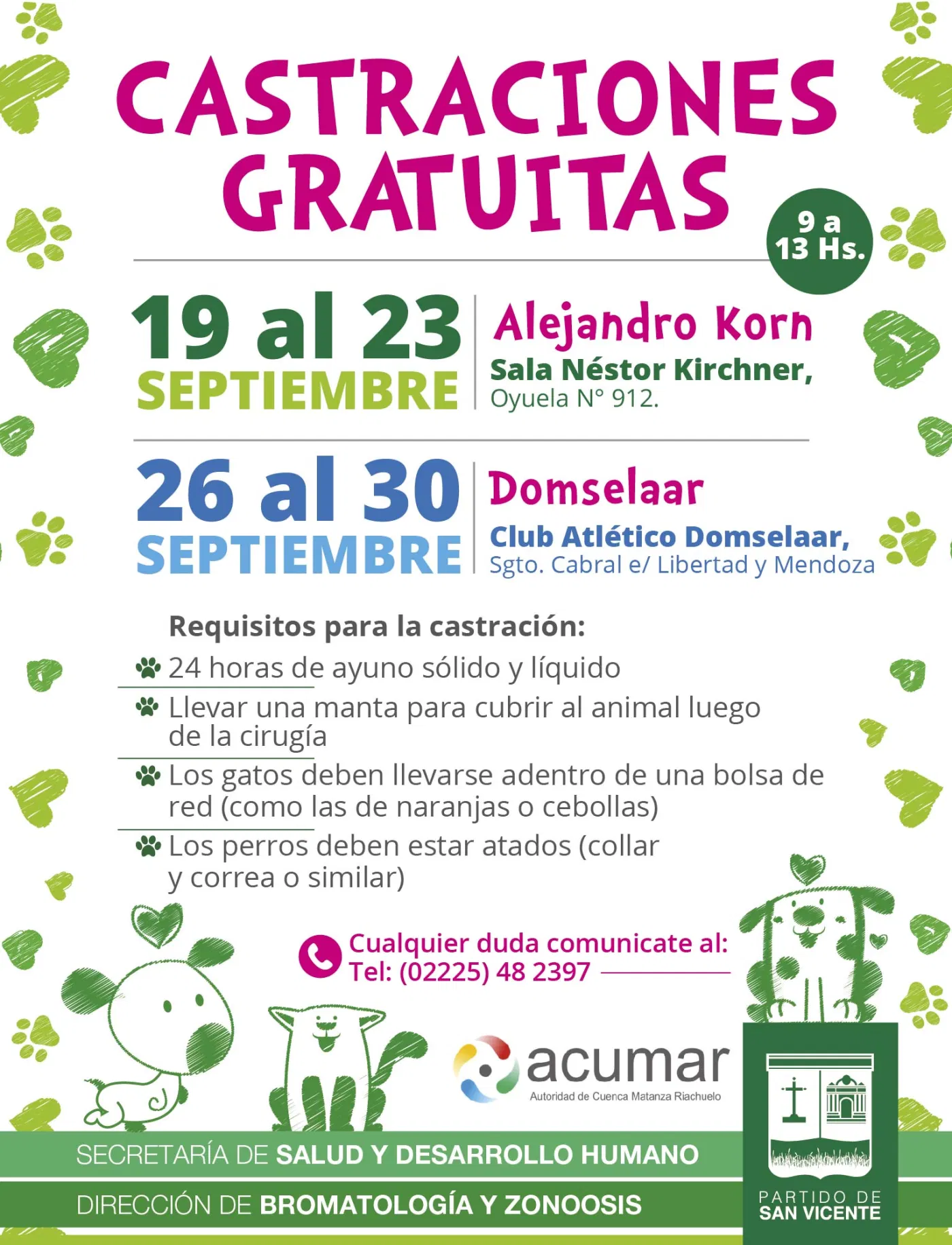 Desde hoy y hasta el 30 de septiembre, la Autoridad de la Cuenca Matanza Riachuelo (Acumar) llevará a cabo en el distrito un operativo de castración de perros y gatos totalmente gratuito.